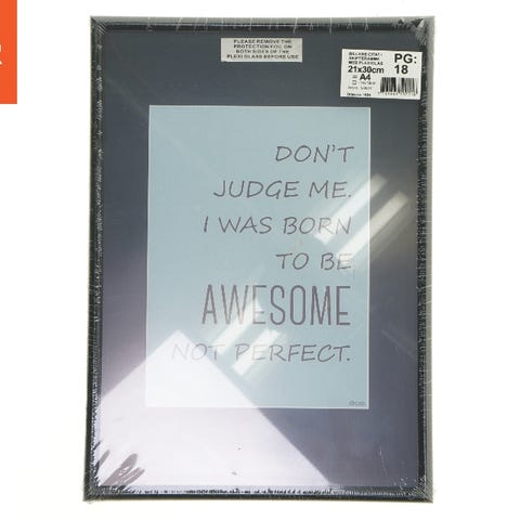 En billedramme af plast med størrelsen 21x30 cm. Rammen har plexiglas foran og en bagbeklædning, som er udstyret med ophængningsbeslag. Den indeholder en velkomsttekst, 'Believe in yourself & you will be unstoppable', inden i. Den er stadig indpakket i beskyttelsesfolie.