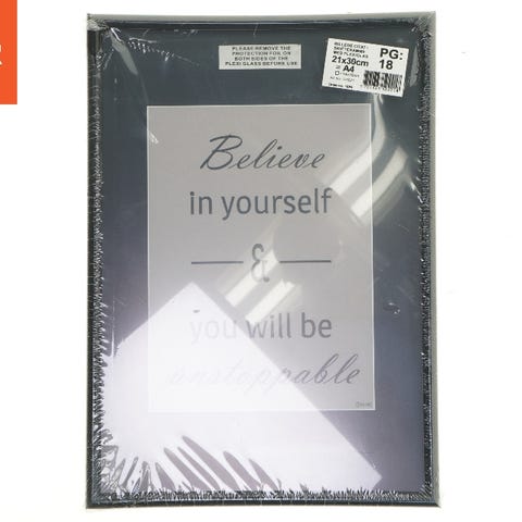 Dette er et indrammet billede, der måler 21x30 cm, med et inspirerende citat der lyder: 'Believe in yourself & you will be unstoppable'. Rammen er lavet af let materiale med plexiglas. Bagsiden af billedet viser muligheden for at stå oprejst med en støtte eller hænges på en væg med de inkluderede metalbeslag.