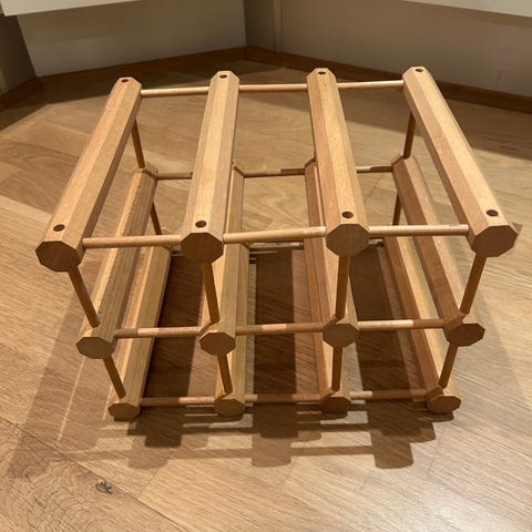 Reol og hylde lavet af vinkasser. Enkelte kasser med tryk. Mål for reol: H. 75, B. 135, D. 70 cm.
