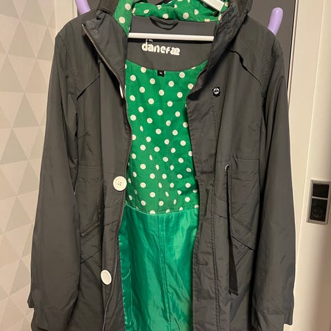Mrk. Danefæ str. XL græsgrøn softshell jakke med hætte som lukkes med lynlås. Har 3 lommer alle med lynlås. Elastikkerne i hætten er slidte, men kan bruges. Jakken er hel, pæn og ren.