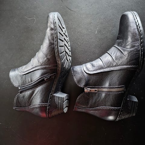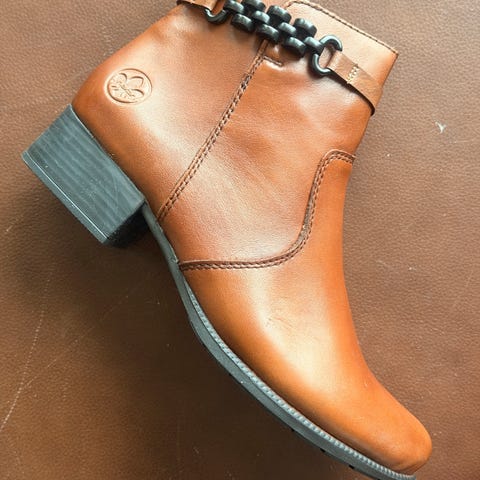 Dejlig støvle fra Rieker med god pasform og støtte i sålen. Desværre er de købt for små. Riekers i sko kan være små i størrelsen så denne 38 er måske nærmere end 37/37,5. Skoen er i kunstlæder med stof og lynlås. Fragt for købers regning.
