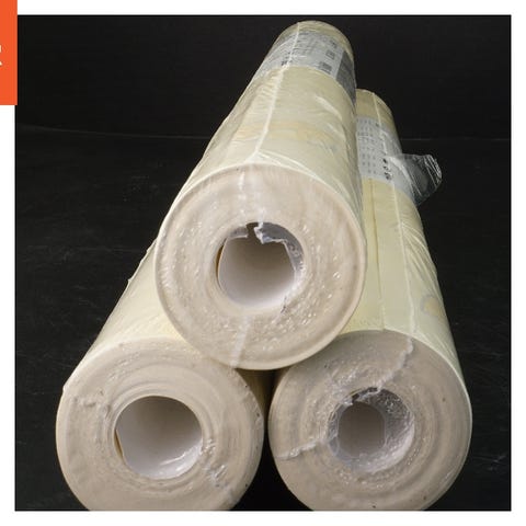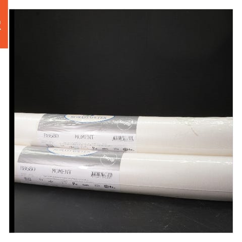 Billedet viser 7 ruller med tapet, der er pakket ind i plastfolie. Alle er i original uåbnet emballage med serienr. B8657. Tapetrullerne har diverse information trykt på emballagen, herunder mærke, modelnummer og andre tekniske specifikationer. De er i en lys farve, perfekt til dekoration af vægge i hjemmet.