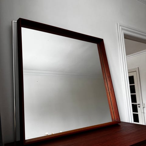 Elegant, slankt spejl med ramme i teak og klassiske, enkle geringshjørner. Passer godt i entré, soveværelse eller som helfigur-spejl. Spejlet fremstår i fin brugt stand med almindelige alders-/brugsspor.
