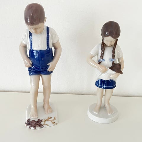 Bing & Grøndahl porcelænsfigurer i glasureret porcelæn. Samlingen omfatter flere motiver, herunder børn, hunde og en figur med gås. Figurerne er udført i hvidt porcelæn med flerfarvet dekoration i afdæmpede nuancer. Undersiden af mindst én figur er mærket med Bing & Grøndahls stempel og modelnummer. Egnet som dekoration i vitrineskab, på hylde eller som del af en samling af danske porcelænsfigurer
