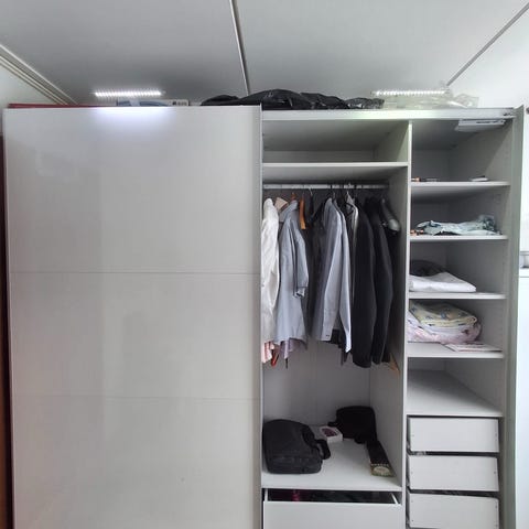 2 stk flotte garderobeskabe med skydelåger, samt indbygget skuffeskab, farve lys eg. De står i dag ryg mod ryg, men kan naturligvis stå i forlængelse af hinanden, Samt en kommode som passer ind i samme stil