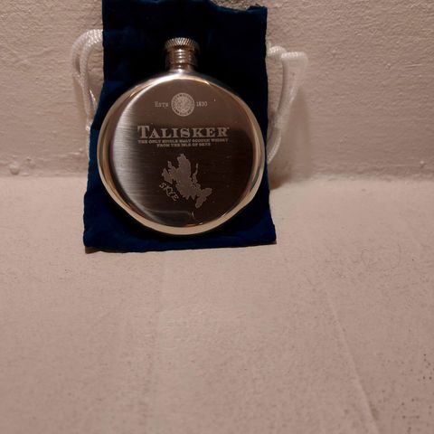 En lommelærke i stainless Steel / brun læder , made in England , 6 oz , mærke SUAM DESIGN , SENDER KUN MED DAO ELLER AFHENTNING .