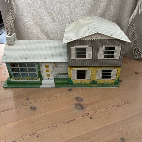 Dukkehus i plast med to etager, udvendig altan og indvendig trappe mellem etagerne. Huset har rødt tag, lyse vægge og brune gulve samt flere vinduer og døre. Egnet til leg med mindre dukker og figurer indendørs. Kan indrettes med møbler og tilbehør efter eget ønske.