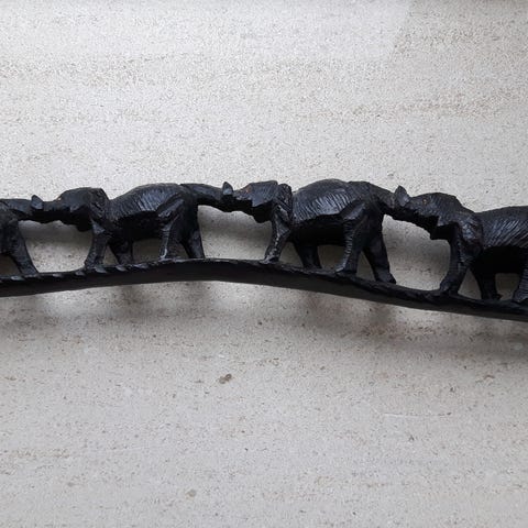 Veludført Elefant parade på rad og række m. høj snabelføring, håndudskåret i et stykke i hårdt træ. Beregnet til stand på hylde elr. lign. Antageligt sortmalet træsort; udført/ lavet til at ligne ægte ibenholt som ex. klavertangenter