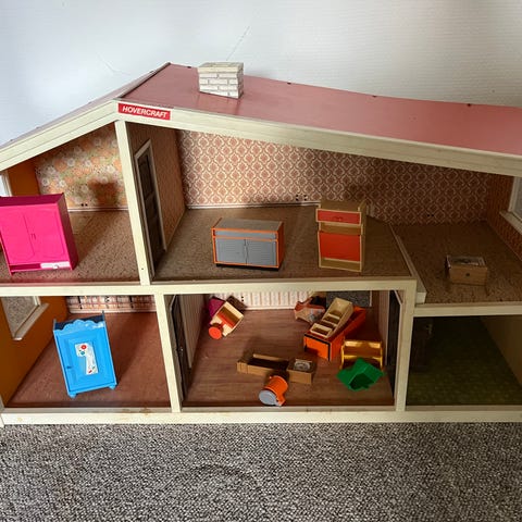 Dukkehus i flere etager med facade i beige og hvid