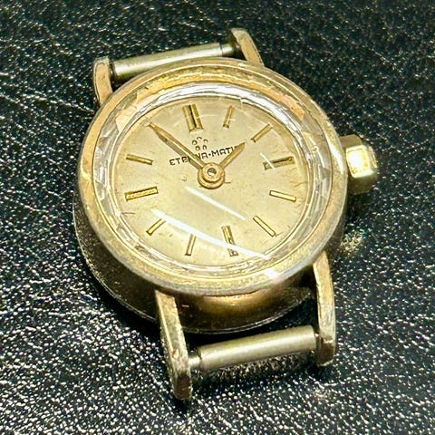 Eterna dameur armbåndsur i guld . Uret har rund urkasse med lys skive og enkle timeindeks. Slankt armbånd i metal med led, som matcher urkassens farve. Mekanisme, størrelse på urkasse 25mm , uret har guld stemplet som fremgår af billede, jeg ved ikke hvilken karat,kan ikke åbne uret. Velegnet som klassisk hverdagsur til kvinder. Uret går upåklageligt men jeg ved ikke om det holder tiden. Ingen garanti gives!