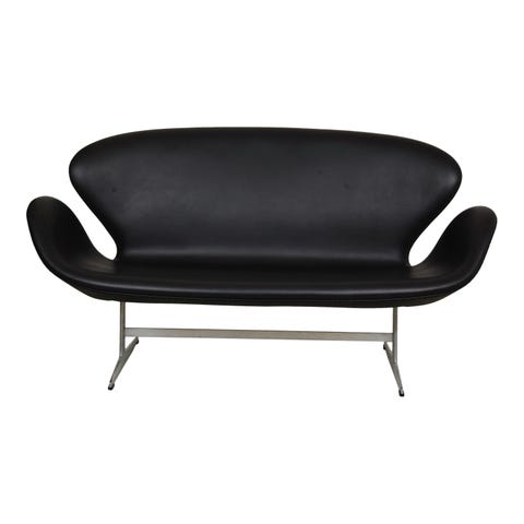 Møbelklassikeren "Svane sofaen" er designet af Arne Jacobsen og udført i sort anilin læder med fod i metal. Sofaen har en god siddehøjde og dermed en god siddekomfort. Formen giver høj ryg og integrerede armlæn, som støtter hele kroppen. Velegnet som komfortabel siddeplads i stue, kontor eller læsehjørne.
