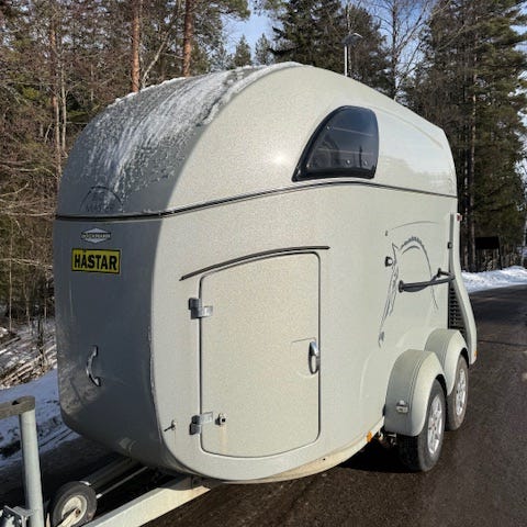Brugt hestetrailer i alu fra Böckmann med stort saddelskab + alubund + sparkeplader og sidepuder.