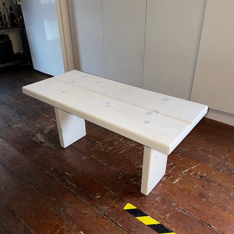 Lille firkantet sofabord i træ i naturfarvet finish. Bordet har kraftige ben og en massiv bordplade, der giver et stabilt udtryk. Egnet som sofabord, sidebord eller lampebord i stue eller værelse.