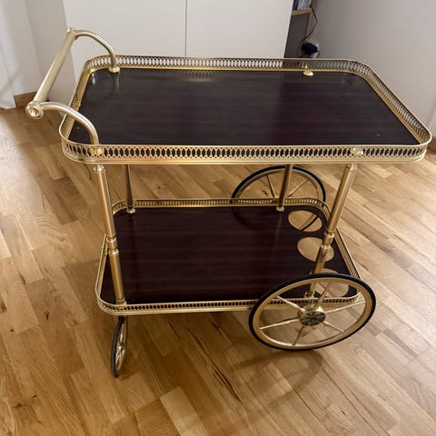 Antik serveringsvogn træ mørk med klapbord og hjul