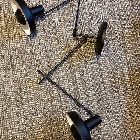 Lækkert mat sort Grupa Arigato lampe (model med lange arme 2x 55 cm). Armene kan indstilles på utallige måder og de to lampe hoveder kan roteres.