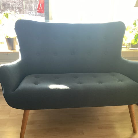 3 og 2 personers sofa i blå stof med synligt træstel sælges samlet. Sofaerne har tre/to løse sædehynder og tre/to ryghynder. Stellet er i lyst træ med lodrette tremmer på ryg og sider. Egnet til stue eller opholdsrum, hvor der ønskes to sofaer med fast træramme og polstrede hynder i stof.