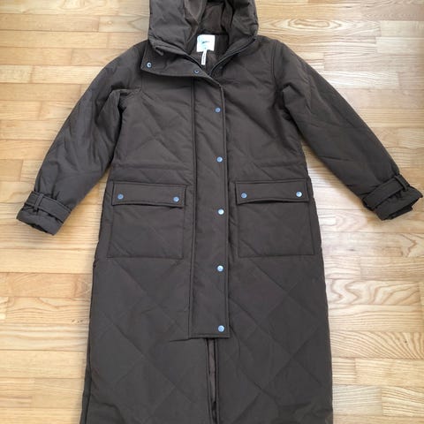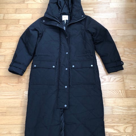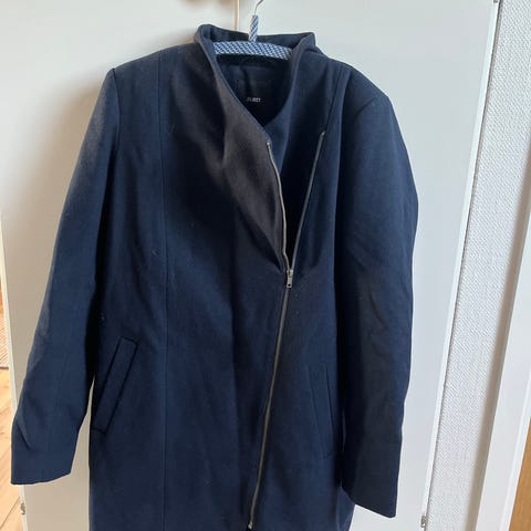Object vinterjakke til kvinder i størrelse L. Jakken er sort og fremstillet i polyester. Modellen er en længere, vatteret vinterjakke med hætte, gennemgående lynlås foran. Jakken har forlommer med trykknap.
