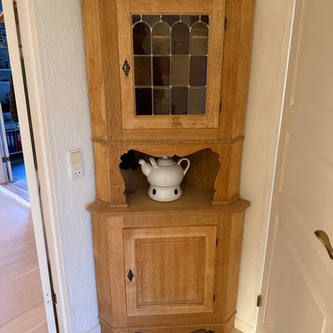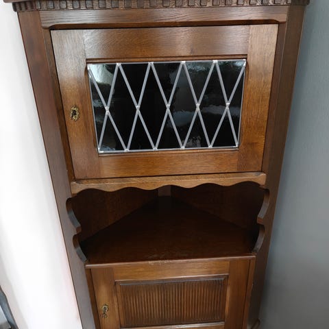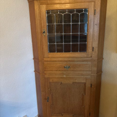 Hjørneskab med glasdør og i egetræ. Skabet har øverste rum med glaslåge med farvet og mønstret glas, samt hylder til opbevaring. Nederst er der lukkede skabsrum med trælåger. Egnet til opbevaring og udstilling af glas, service eller andre genstande i stue, spisestue eller køkken. Fremstår som fritstående hjørneskab i egetræ.