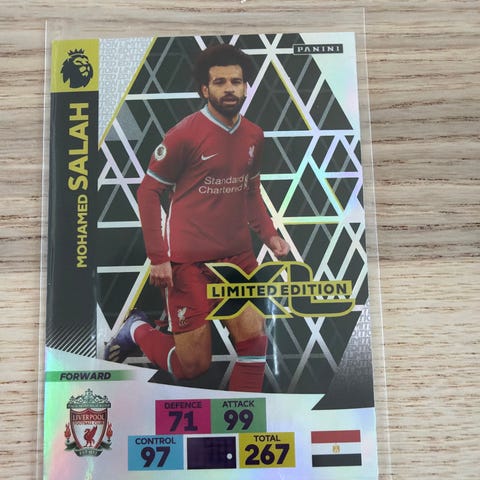 Panini Adrenalyn XL Bruno Fernandes Limited Edition fodboldkort fra Premier League sæson 2020/21. Kortet viser Bruno Fernandes i Manchester United hjemmebanetrøje og er markeret som midtbanespiller. Forsiden har holografisk effekt samt spillerens statistik med angreb, kontrol og samlet rating. Bagsiden viser Premier League-logo, Manchester United-logo, Adrenalyn XL-serien og Panini-logo. Egnet til samling og bytning af officielle Premier League trading cards.