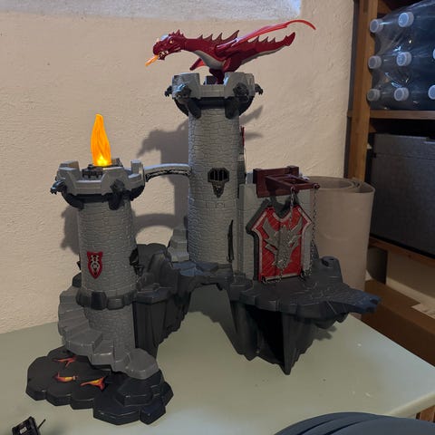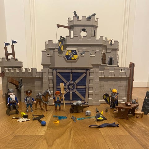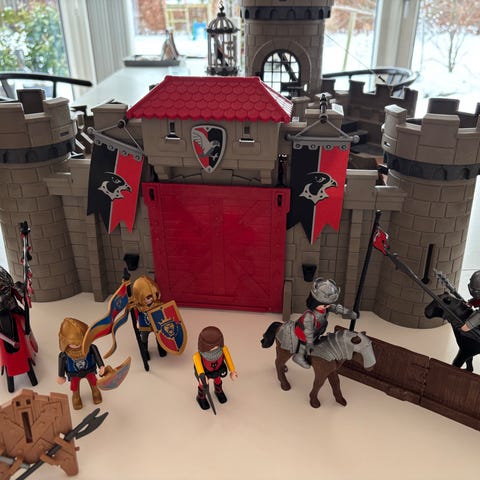 Playmobil ridderborg legetøjssæt med borgdele, tårne og port. Sættet indeholder flere Playmobil-figurer i riddertema samt forskelligt tilbehør som våben, skjolde, flag, dyr og andre smådele. Egnet som byggesæt og rolleleg i middelalder- og ridderunivers for børn.