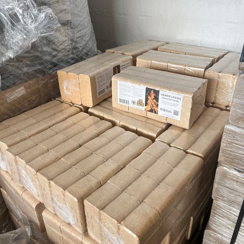 Træbriketter på palle. Pallen er stablet med briketter pakket i plast, egnet som brændsel til brændeovn eller fyr. Velegnet til opvarmning, hvor der ønskes træbaseret brændsel i briketform.