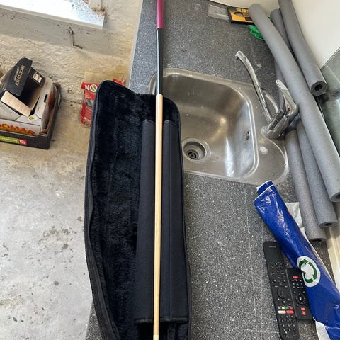 En gammel billardkø i sort kuffert , hard rock maple, længde 140 cm , mangler spids , Søgeord! Samler, spil leg, game , SENDER KUN MED DAO ELLER AFHENTNING.