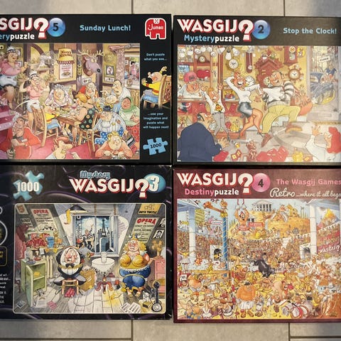 Wasgij puslespil samling. 11 stk. alle er intakte men der kan være enkelte der har tegn på brug. Fx er vi lige nu ved at færdiggøre nr 26 Destiny og der var en bukket brik i posen da vi åbnede den. 2 af dem er lagt to gange resten er lagt en.