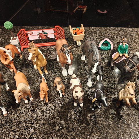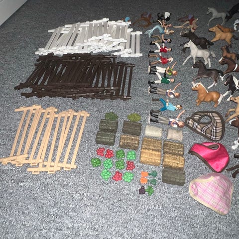 Hestefarm med staldbygning, 12 hestefigurer, 3 hundefigurer, hegn, rytterfigurer, fodertrug, grøntsager, høballer og redskab.