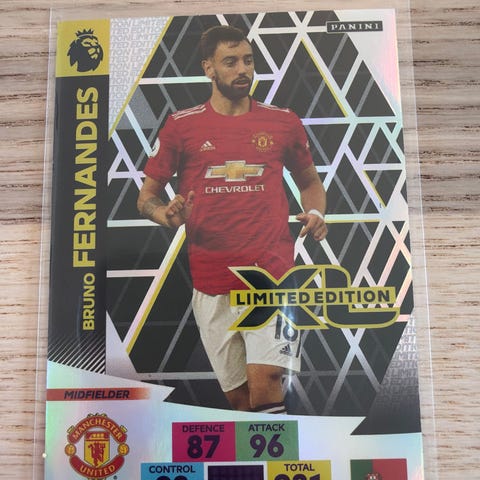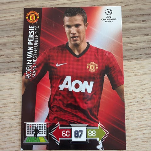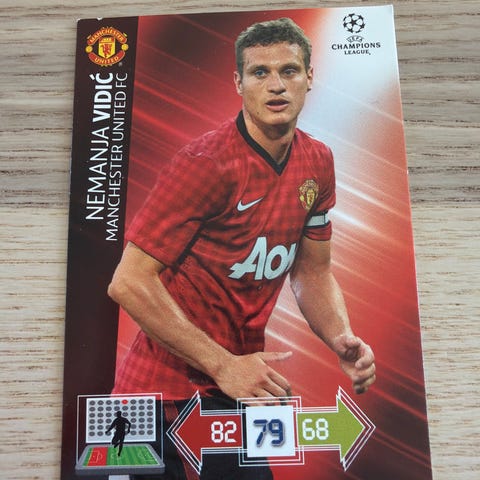 Panini Adrenalyn XL Nemanja Vidić fodboldkort fra Manchester United FC, UEFA Champions League sæson 2012-2013. Kortet viser spilleren i hjemmebanetrøje med klublogo og Champions League-logo på forsiden. Bagsiden indeholder spilinformation, Adrenalyn XL-logo samt aktiveringskode til brug i det tilhørende kortspil. Egnet til samling eller brug i Panini Adrenalyn XL fodboldkortspil.