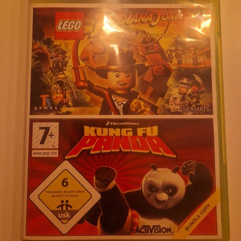 Xbox 360 spilpakke med LEGO Indiana Jones og Kung Fu Panda. Fysisk udgave i plastcover med to separate discs, én til hvert spil. LEGO Indiana Jones er et action- og eventyrspil baseret på Indiana Jones-filmene i LEGO-universet. Kung Fu Panda er et action- og platformspil baseret på animationsfilmen af samme navn. Begge spil er mærket til aldersgruppen 7+ ifølge PEGI-klassificeringen og er beregnet til brug på Xbox 360-konsol.