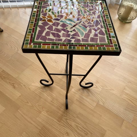 Bord pyntet med Bjørn Wienblad og mosaik. Fra hjørne til hjørne 50 cm. H 45 cm.