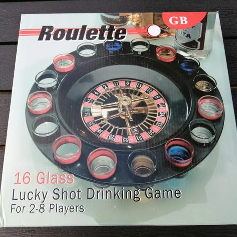 Roulette Party Game drikkespil med shotglas. Spillet består af en rouletteplade med tal og farver samt flere shotglas placeret rundt om kanten. Hvert glas har markeringer, så det kan tilknyttes bestemte tal eller farver på rouletten. Egnet som selskabsspil til voksne, hvor deltagerne kan bruge glassene til drikke efter eget valg. Spillet kan bruges af flere personer ad gangen og er velegnet til sociale sammenkomster og fester.