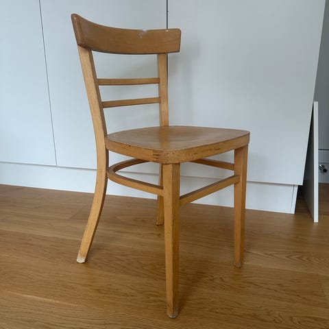 En fin vintage fyrretræs stol sælges
