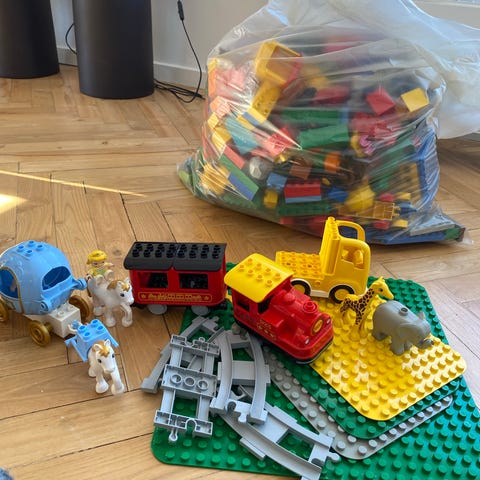 LEGO DUPLO klodser og køretøjer blandet sæt ca. 12 kg. Indeholder forskellige DUPLO klodser i flere farver samt diverse køretøjer som lastbiler og helikopter, egnet til små børn. Desuden en stor mængde togskinner til DUPLO tog og flere togvogne.