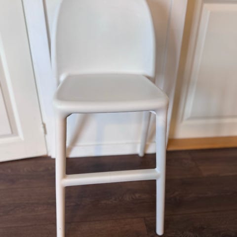 IKEA børnestol i hvid. Stolen har ryglæn og tværstang som fodstøtte. Egnet til børn og kan bruges ved bord, i børneværelse eller andre steder i hjemmet, hvor der er behov for en mindre stol til børn.