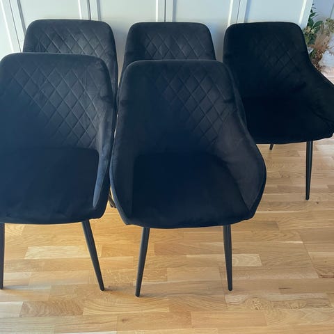 Stolene er i lysebrun velour og ben i pulverlakeret metal.