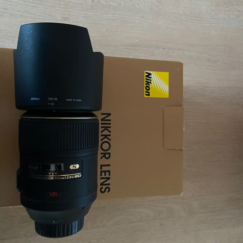 Nikkor micro 105 mm f 2,8 G afs VR i meget flot stand, leveres med dæksler samt HB 38 modlysblænde