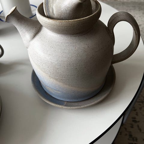 4x4 kopper og tallerkener/underkopper, i stentøj lavet af keramiker Jette Hellerøe, i skønne lysblå/grå farver, kop 7 cm høj 7 bred, tallerken 18 cm, i alt kr 275 uden skår. Tekanden koster kr 75 er 15x15 cm Samlet pris kr 300 kun mobilePay sendes ikke