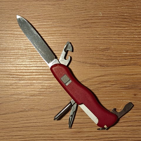 Dekorativ vægmonteret kniv på træplade. Kniven har et buet blad i metal og et udskåret håndtag med organiske, skulpturelle former. Den er monteret på en aflang træplade med mørk finish, beregnet til ophæng på væg som udsmykning eller samlerobjekt. Ingen synlige producent- eller modelangivelser på genstanden.