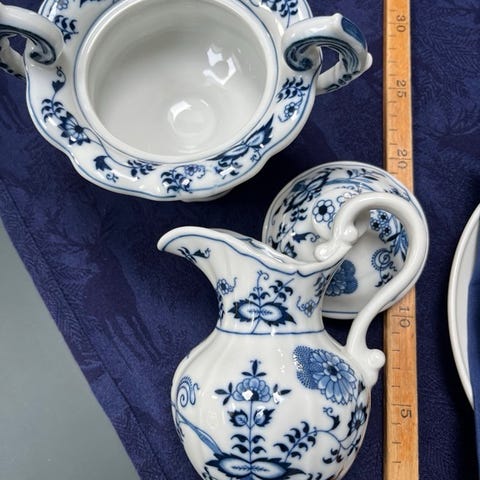 Porcelæn, Sukker & flødesæt, Løgmønster, SAMLET PRIS Løgmønster Stort sæt Sukkerkrukke el. skål til slik på kaffebordet, med låg og Mælkekande, ca 15 cm i højden, tænker kanden rummer omkring 5 dl. mælk. Løgmønster porcelæn, er uden tvivl Meissens mest kendte og kopierede spisestel. Mønstret har også været udført på Royal Copenhagen så tideligt som sidst i 1800 tallet. Det Musselmalede som vi elsker så højt i dag, er en senere forenkling af netop LØGMØNSTERET og i samme blå nuance. Jeg er stor fan, af at bruge mange forskellige blå stel sammen, både i vores tallerkenrækker og borddækning. Syntes det bliver meget mere interessant, når Fattigmands Blå Blomst, Musselmalet, Løgmønster og Mega Mussel blandes. Dette sæt er ikke Meissen, men håndmalet Japansk porcelæn fra 40érne Blue Danube.Sælges kun samlet