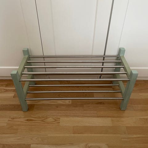 IKEA skoreol i hvid. Reolen har en rektangulær topplade og to hylder med metalstænger, som giver plads til opbevaring af flere par sko. Egnet til entré, gang eller garderobe til organiseret opbevaring af fodtøj.