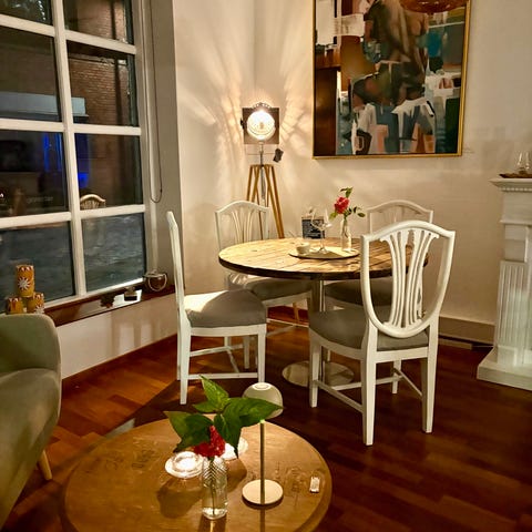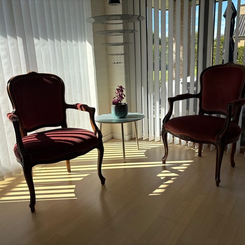 2 stole med armlæn og 4 uden. Gode at sidde i.