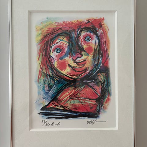 Abstrakt litografi udført af livsglædens kunstner Hans Chr. Thomsen med farverigt motiv i stærke nuancer af rød, gul, blå og grøn. Motivet består af organiske, figurative former og konturer, der kan tolkes som ansigter eller kroppe, signeret og nummereret. Litografiet egner sig som vægdekoration i stue, kontor eller andre opholdsrum, hvor der ønskes et udtryksfuldt og farverigt kunstværk. Prisen er pr. stk. og fast