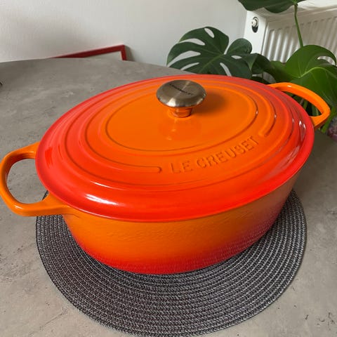 Le Creuset gryde i støbejern i cremefarve. Rund model med låg og to håndtag. Emaljeret inderside og yderside, egnet til tilberedning af gryderetter, supper og braisering. Kan bruges på de fleste komfurtyper og i ovn, afhængigt af producentens anvisninger. Str. 28