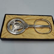 Produktet er en skære- eller åbneredskab i rustfrit stål med et stilrent design. Det præsenteres i en elegant sort æske med gyldent indvendigt foer. Metaloverfladen har en blank finish.