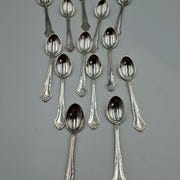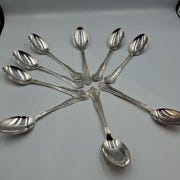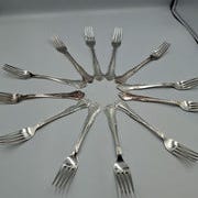 Sættet indeholder flere skefork, der er lavet af rustfrit stål med en blank finish og detaljeret design.