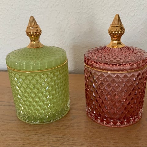 Sættet består af to cylindriske krukker med tilhørende låg og fod.