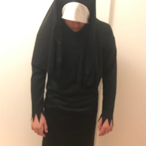 Designet er inspireret af en nonnedragt i sort og hvid. Stoffet er let og syntetisk, egnet til udklædning ved fx halloween eller temafester.