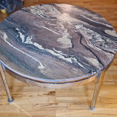 Rundt sofabord med marmorlook , grøn . Meget velholdt. Bredde 60cm , højde 42,5 cm .