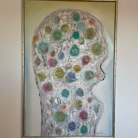 Maleriet er udført med kraftige, markerede streger og lag af farve, der giver en struktureret overflade. Værket er monteret i ramme og ophængsklar med snor på bagsiden.